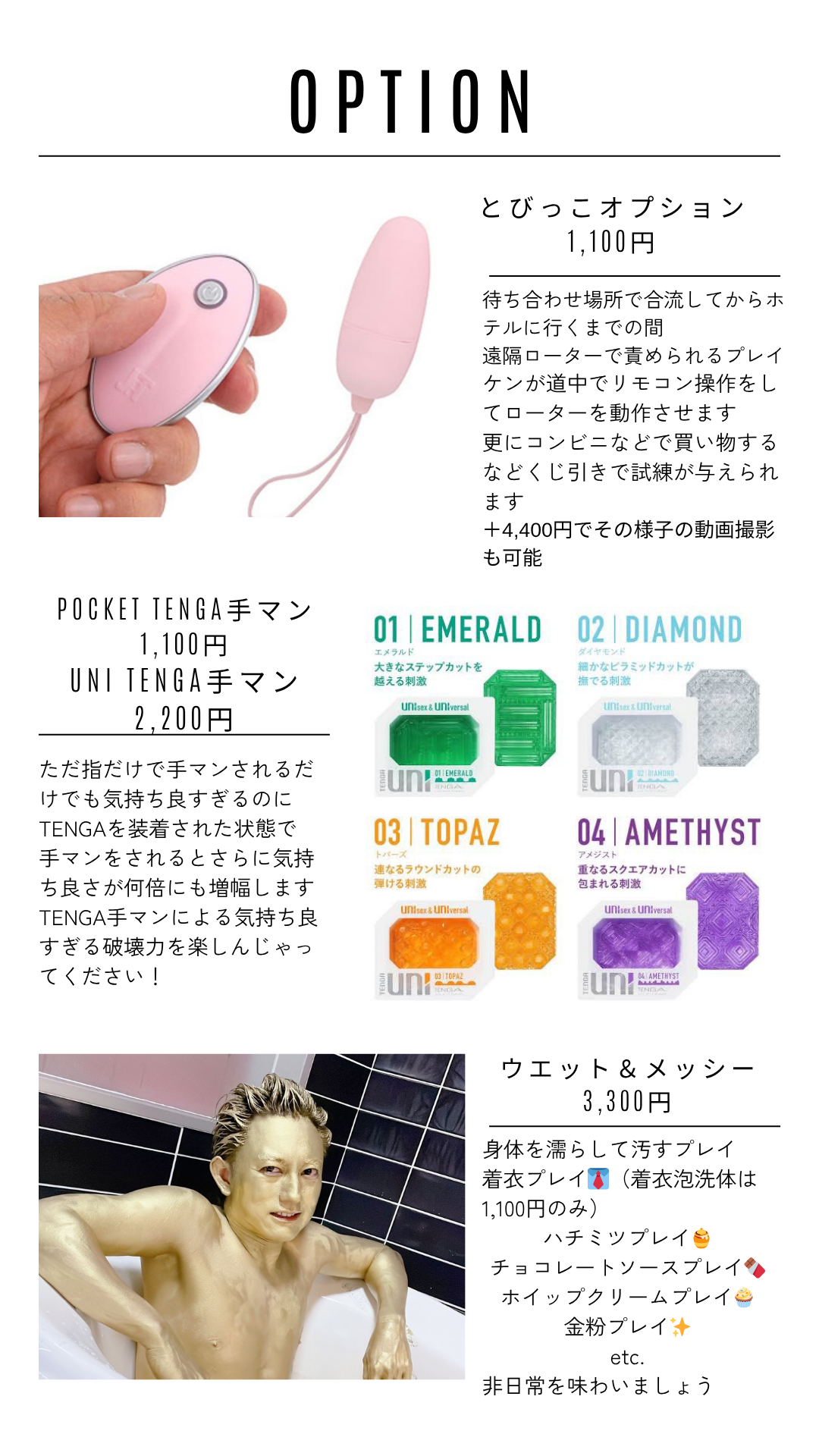 噛みつき(跡残ってもOK)、ビンタ、スパンキング、前立腺、首絞め、低温蝋燭、男の潮吹きチャレンジ、バラ鞭、ウエット&メッシー、飲尿