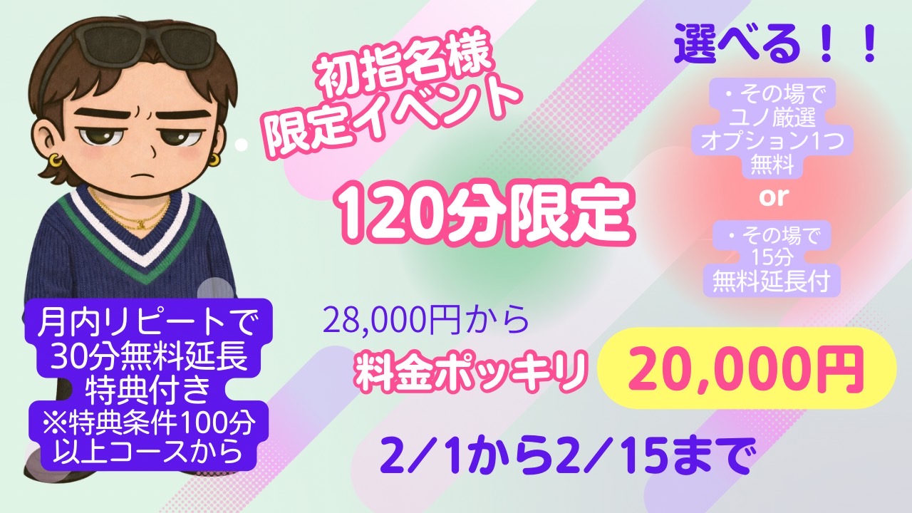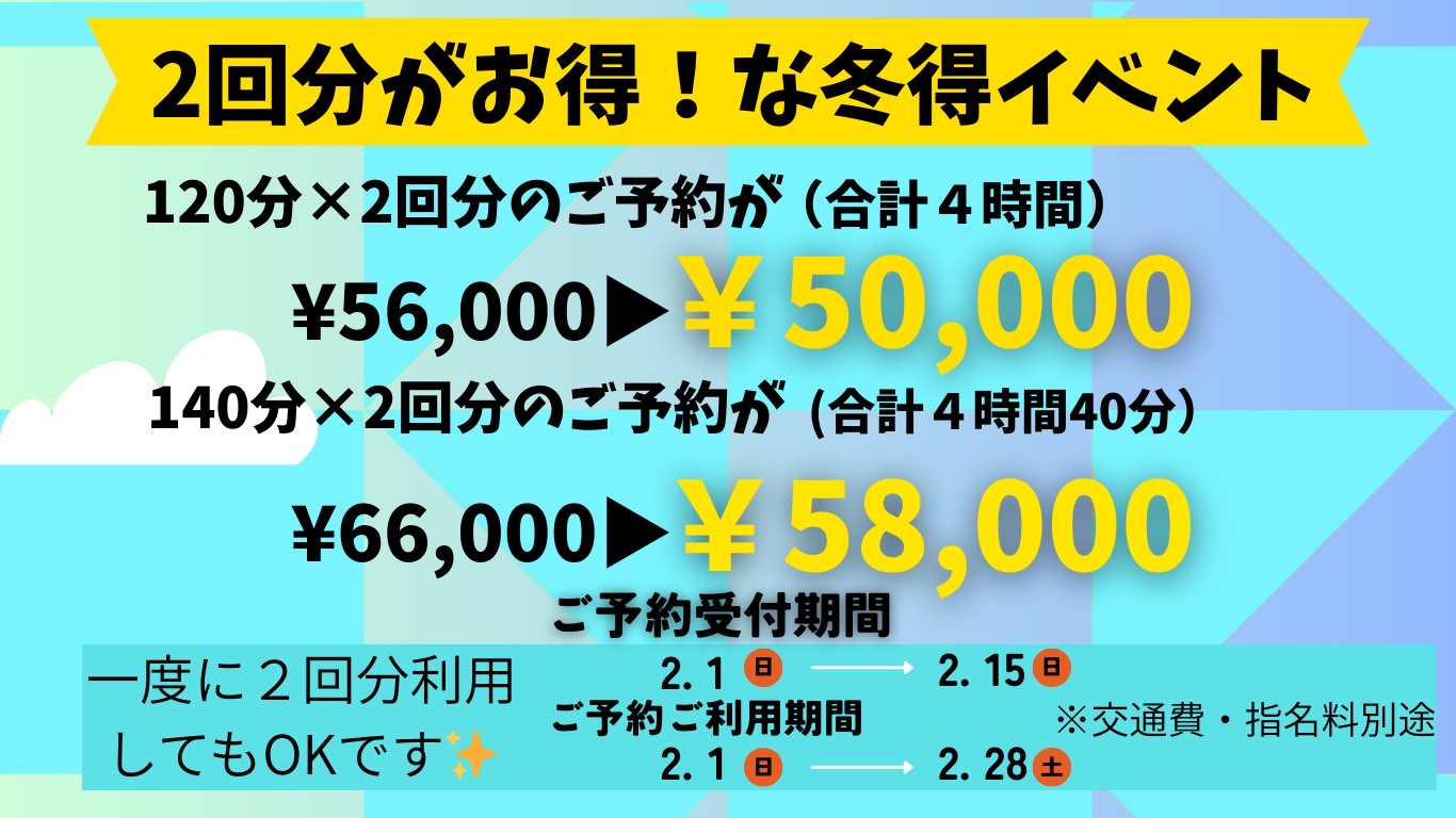 ・口コミをご投稿頂いた特典として、次回ご利用時のコース時間に無料の延長分をお付けします。