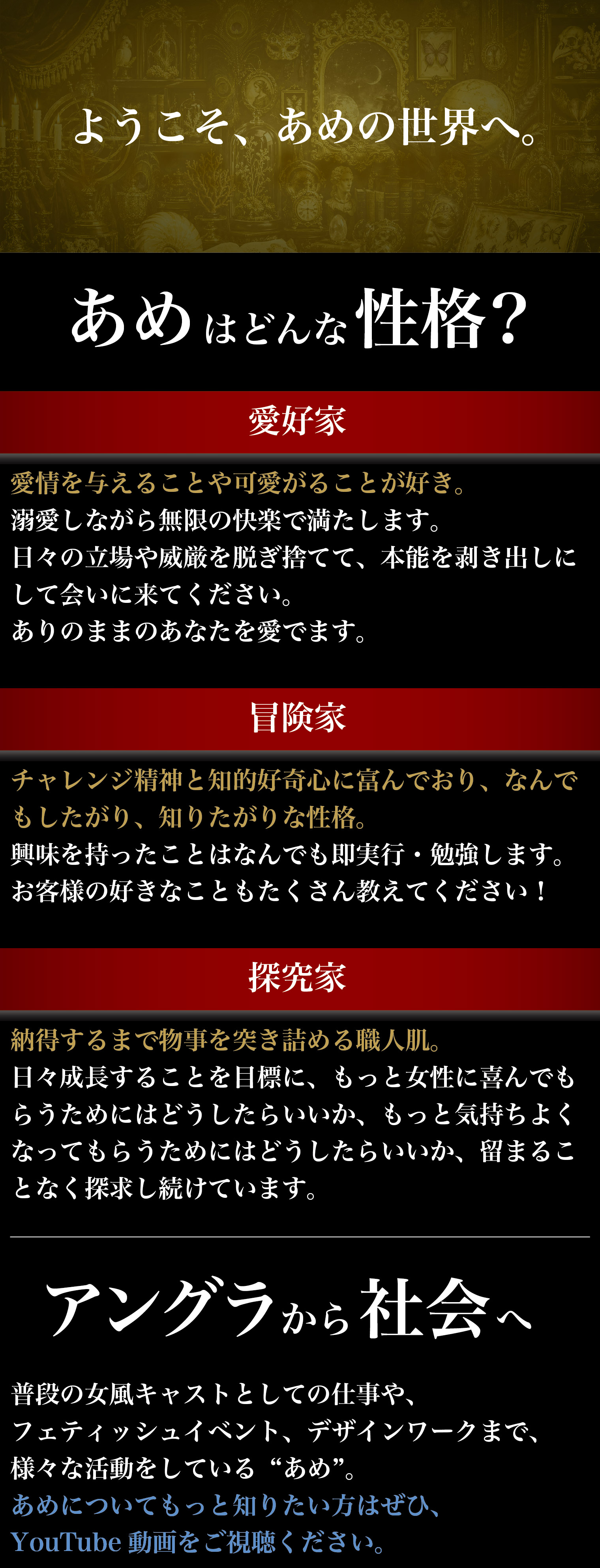 みんなストーリープレイに興味あるけどオーダーできてない人って「私演技できない」とか「なりきれるのかな」ていう心配があると思うんだけど、全く問題ないです!全部あめ様に任せておけば大丈夫!こっちにセリフ求められたりもしないし、ほんとにびっくりするくらい自然な流れでいつの間にか始まってて、アメ先生にじわじわ攻め寄られて、最初は優しめ礼儀正しいカテキョの先生だったのに、だんだんオラオラスパンキング先生になっちゃってるんだけど、凄いのはずっと徹底して敬語で攻めてくるからゾクゾクするし、「カテキョが保護者を犯してるシチュ」を想像させるリアルな情景をノンストップで言葉責めとして使ってくるから、気づけば完全脳内ドラマ化…「なりきれるかな」とか考えてるひまない!おまけにちょっとリアルなプライベートまでセリフに練り込んで攻めてくるから背徳感と快感で涙と汗で顔ぐちゃぐちゃになりながら叫んでました。