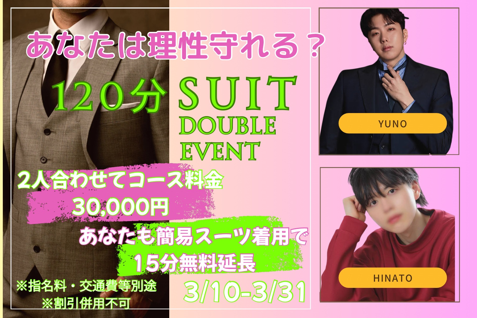2回目のヒナトくんと、初めましてのユイさんでダブルお願いしました。