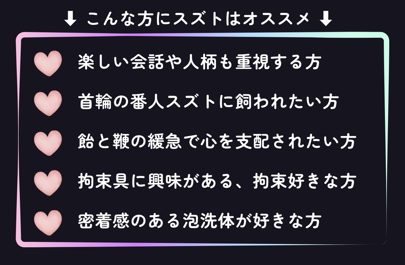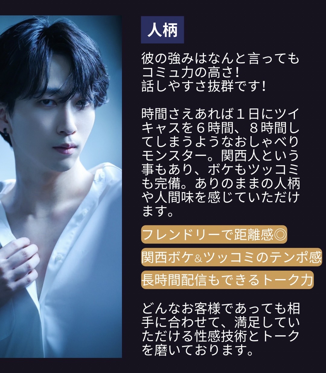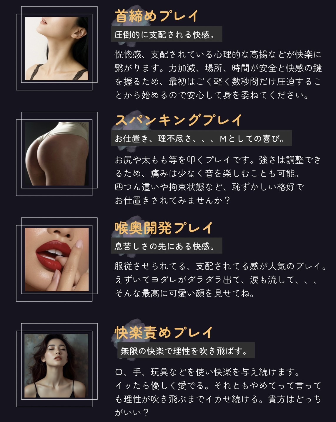 新しいプレイを試してくれたり、要望を聞いてくれたりと、毎回新鮮味があるため何回会っても飽きません。