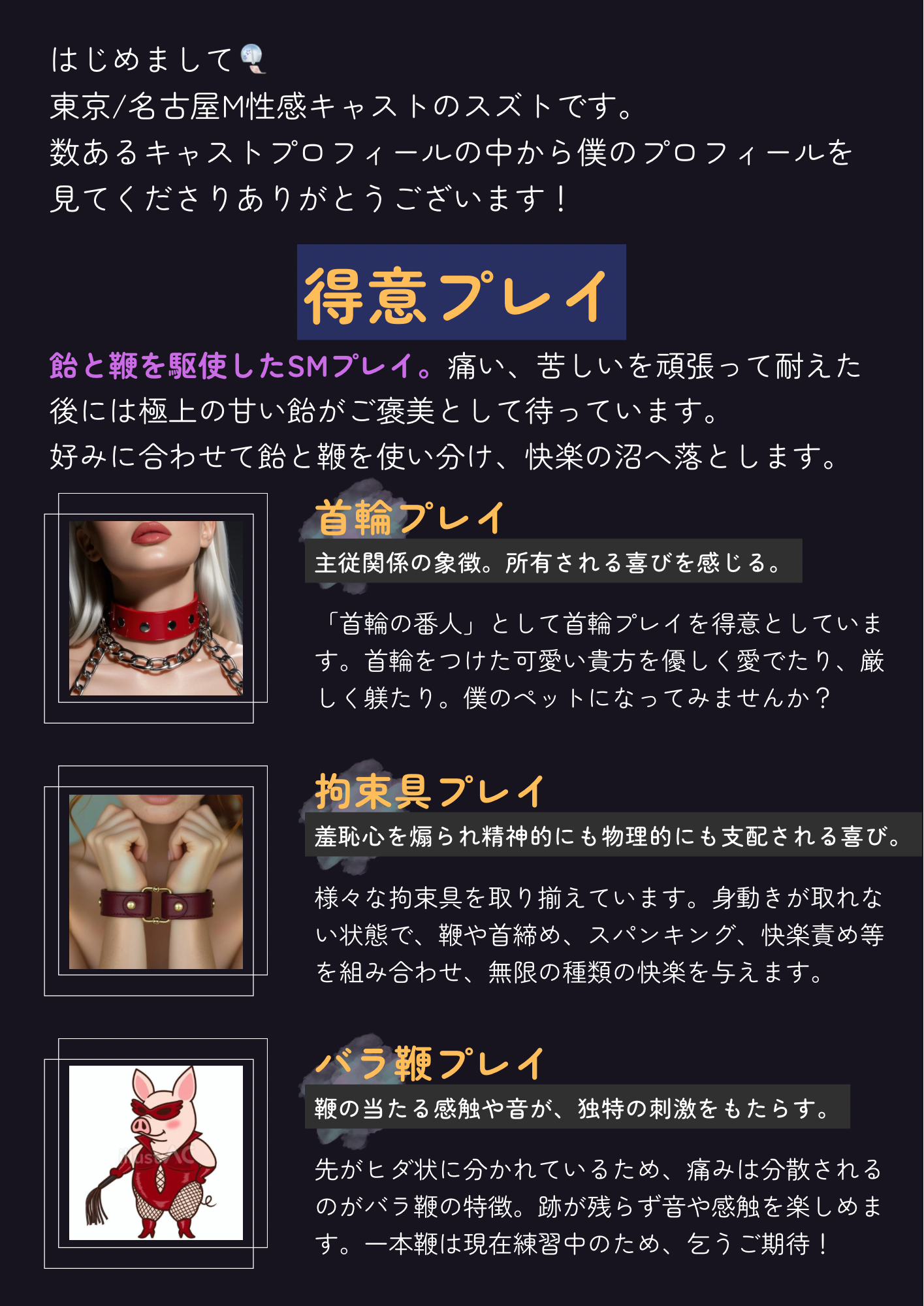 イチャ甘プレイをしたい人からSMプレイをしたい人、特殊プレイをしたい人まで幅広くオススメできるキャストさんです。