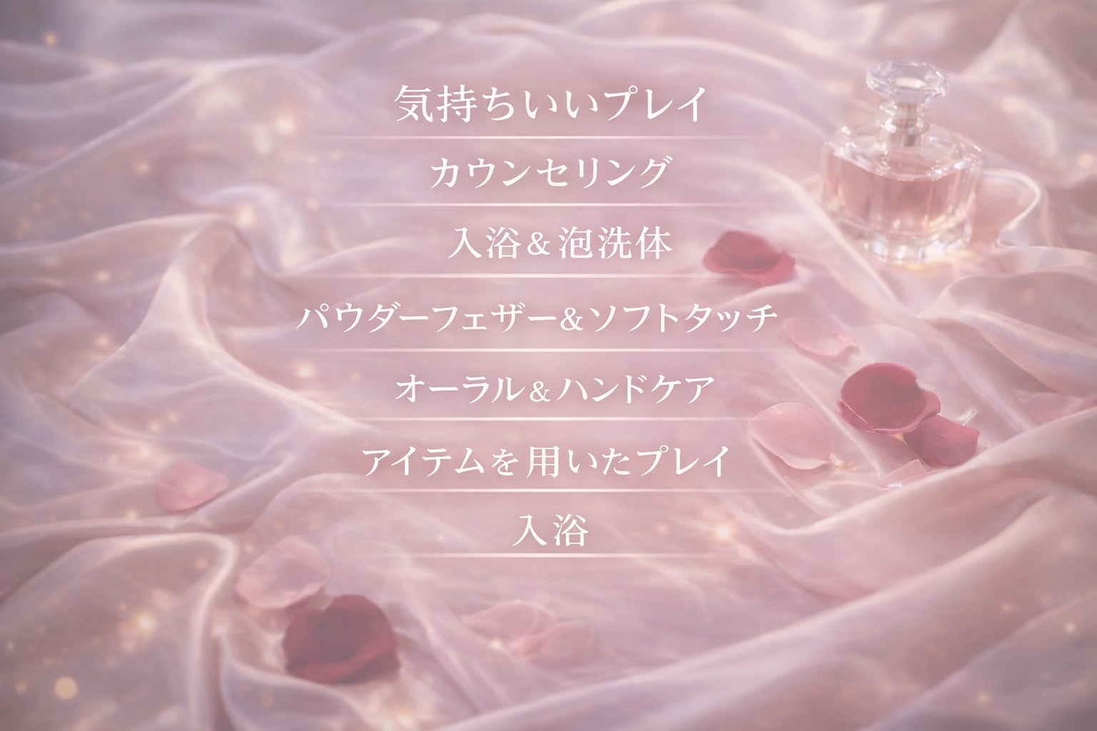 - ソフトタッチ、感度上げ、手マン、クンニ