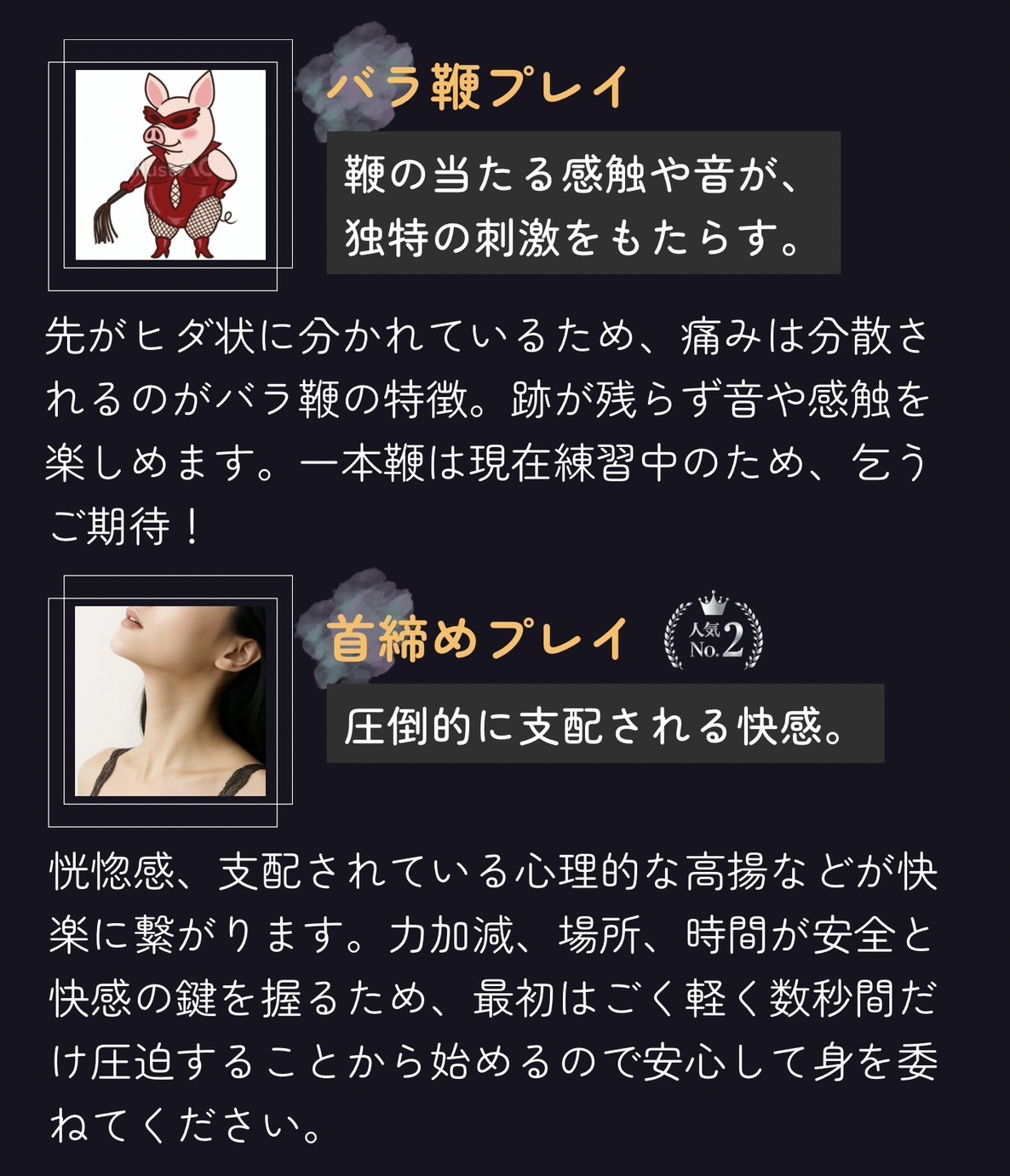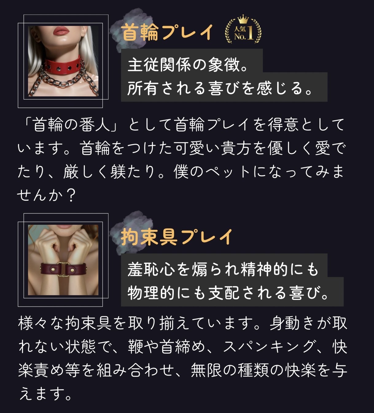 - ホットオイル・首輪・鉄棒拘束具・吊り扉拘束具・鞭