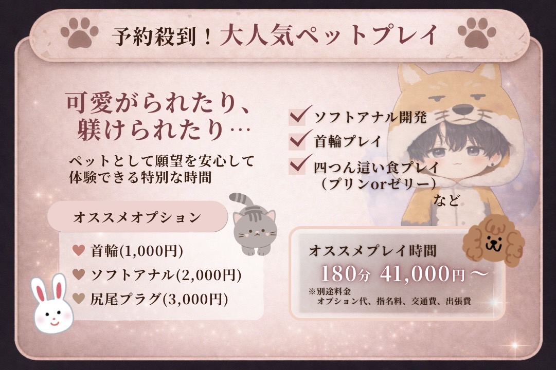 前回のペットプレイが楽しかったので、今回もペットプレイイベントで予約しました。けど、振り返ってみるとペットプレイしたっけ?ってなりましたが、とっても楽しかったので良しです笑